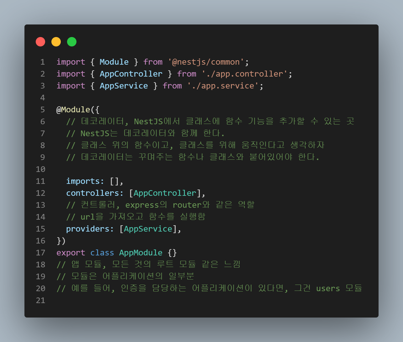 // NestJS는 컨트롤러를 비즈니스 로직과 구분 짓고 싶어한다.