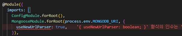 '{ useNewUrlParser: boolean; }' 형식의 인수는 'MongooseModuleOptions' 형식의 매개 변수에 할당될 수 없습니다. 개체 리터럴은 알려진 속성만 지정할 수 있으며 'MongooseModuleOptions' 형식에 'useNewUrlParse'이(가) 없습니다.