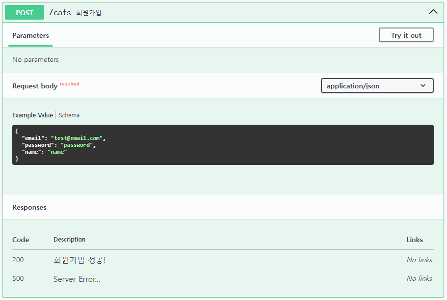 Example Value의 내용이 위와 같이 채워지고 Responses의 내용이 생겼음을 확인할 수 있다.
