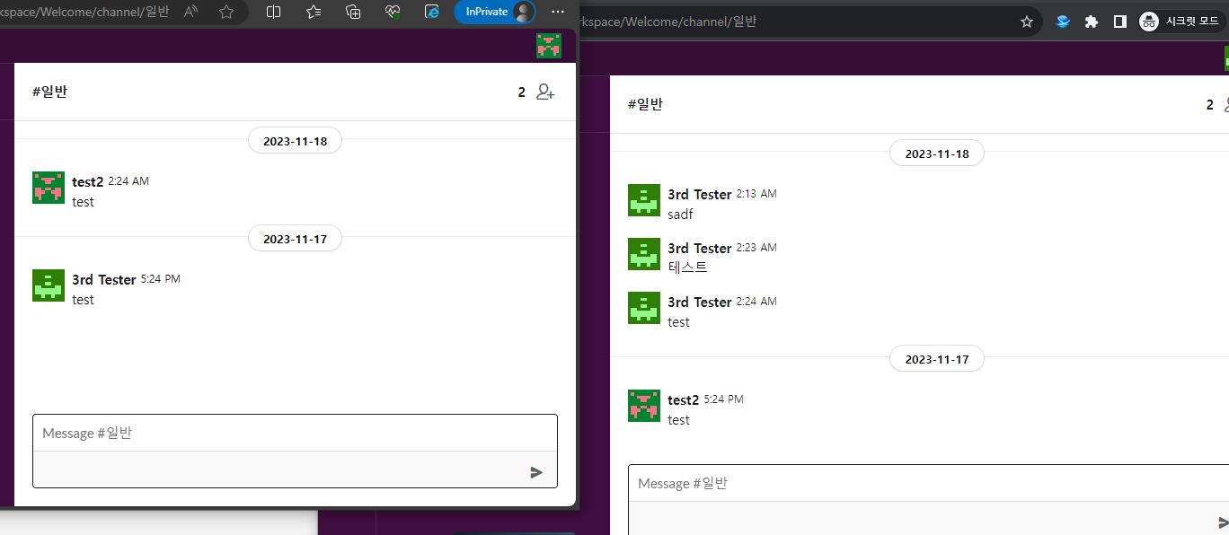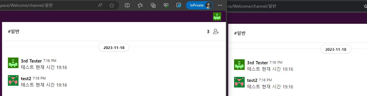 이후 브라우저에서는 서로의 채팅 입력 시간이 정상적으로 확인되나
