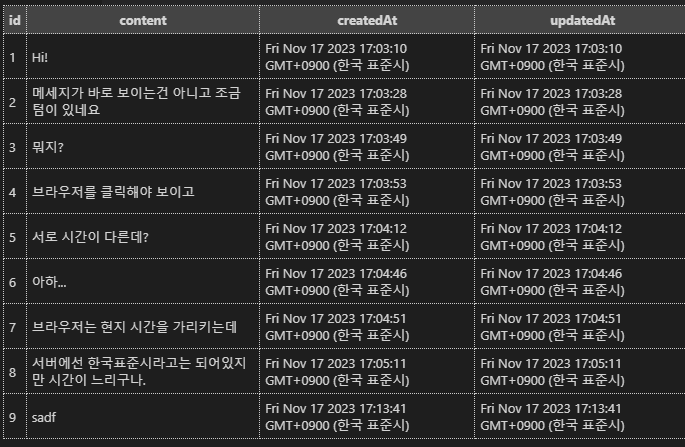 DB 타임존 변경 이후 다시 채팅 테스트를 진행하였고