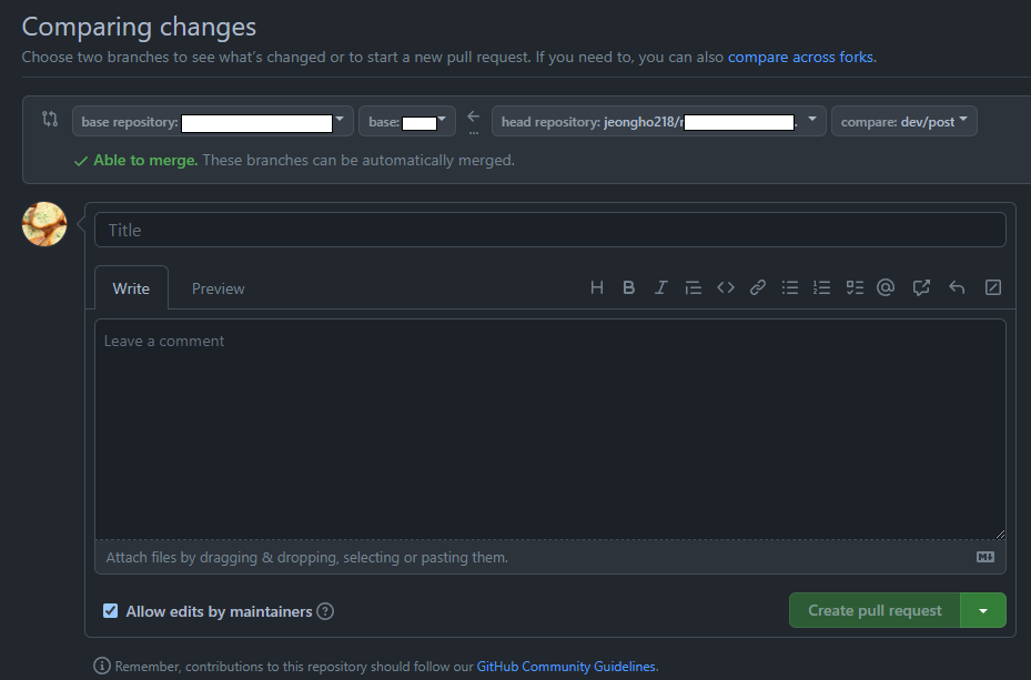 커멧 메세지를 정성스럽게 작성하여 Create pull request 클릭